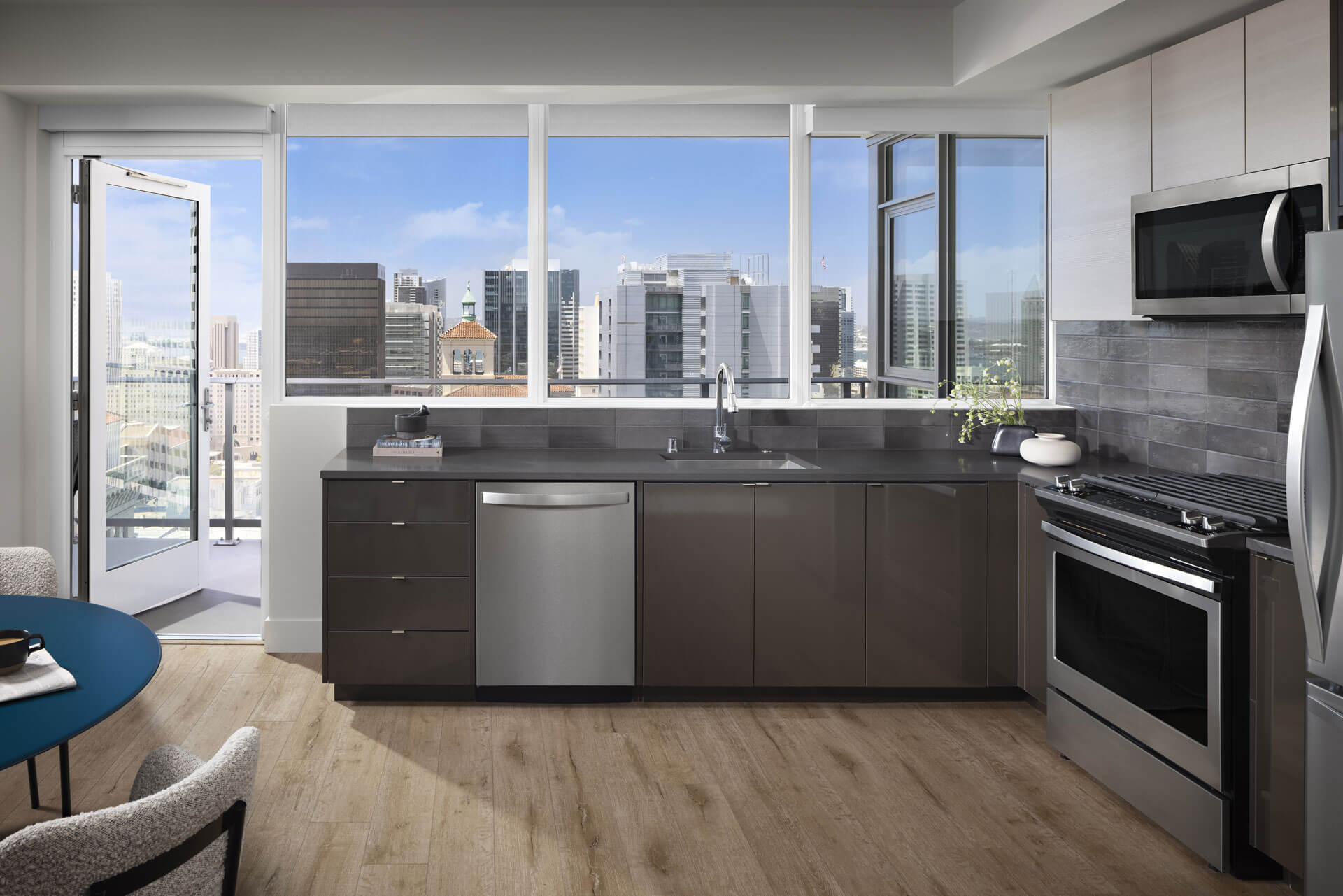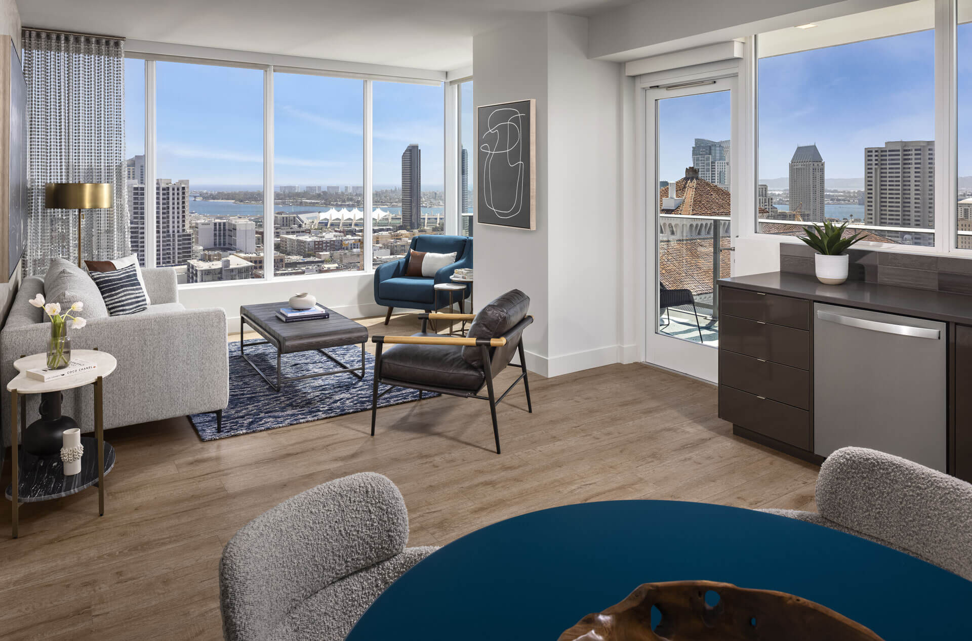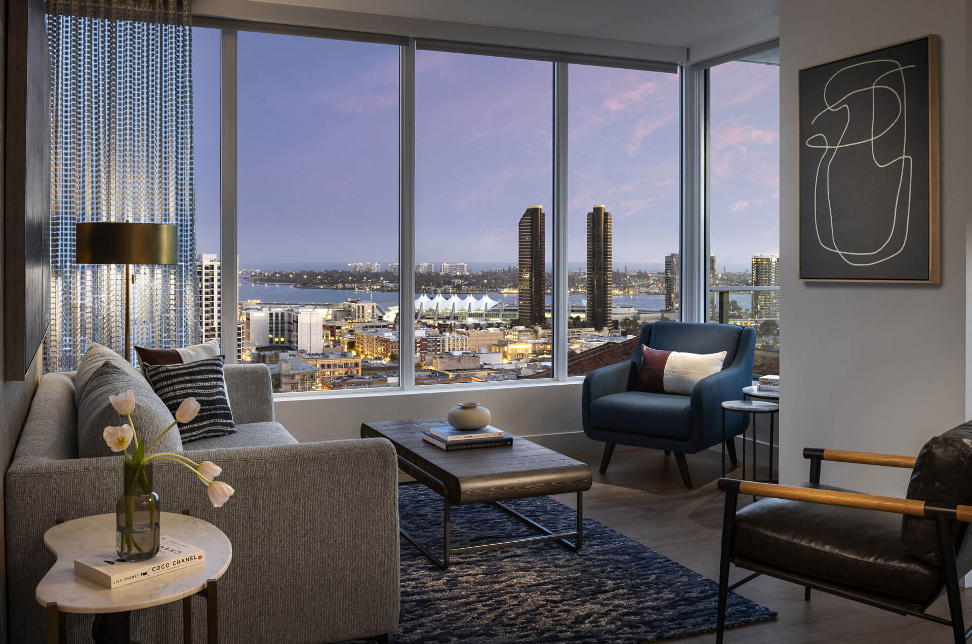 The interiors are available in two distinct palettes featuring beautiful finishes, like quartz countertops, sleek stainless steel appliances and warm wood plank-style floors. These are set against light-filled windows that offer a selection of views, from overlooking the vibrant city to San Diego Bay to distant horizons over the Pacific.