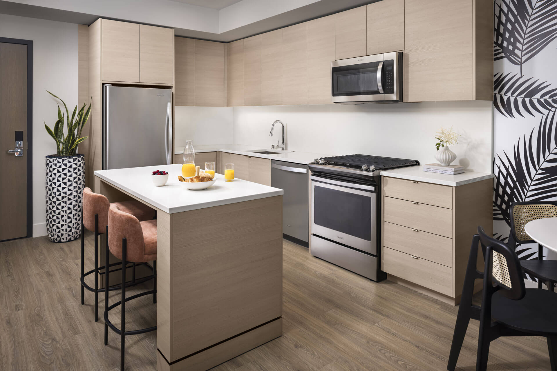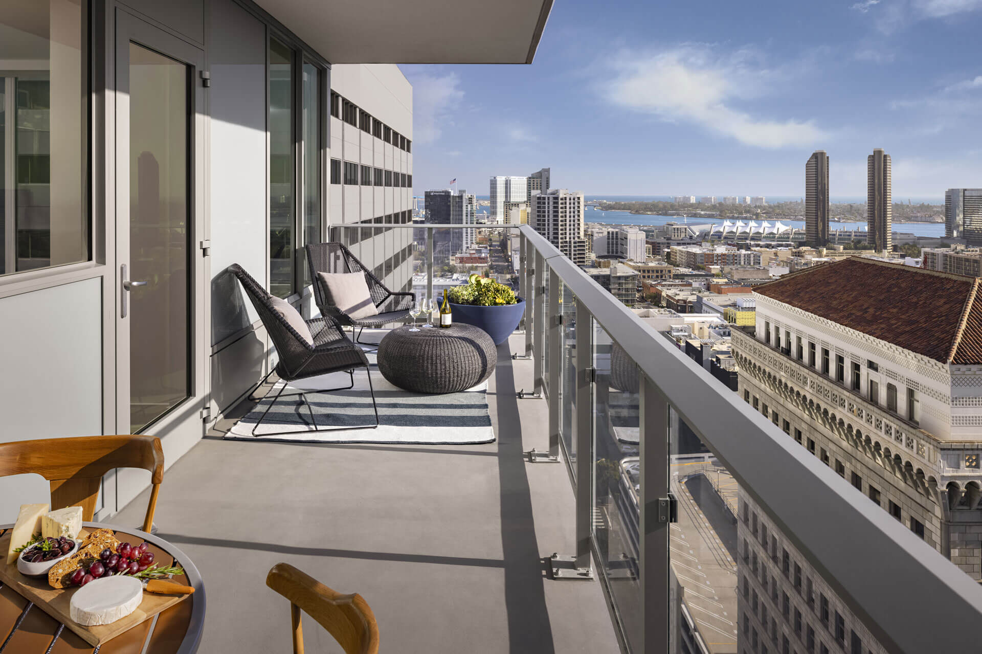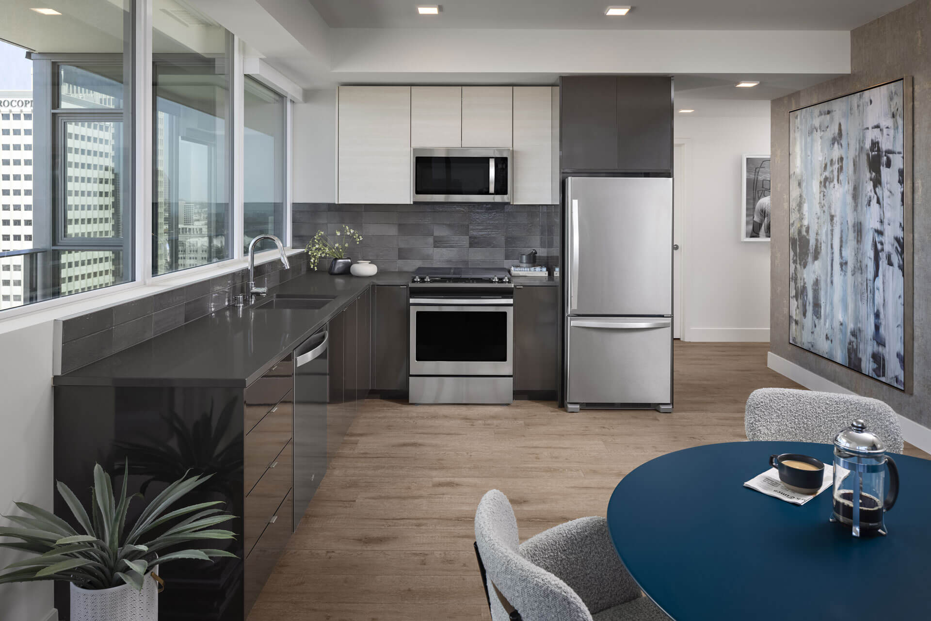 The interiors are available in two distinct palettes featuring beautiful finishes, like quartz countertops, sleek stainless steel appliances and warm wood plank-style floors. These are set against light-filled windows that offer a selection of views, from overlooking the vibrant city to San Diego Bay to distant horizons over the Pacific.